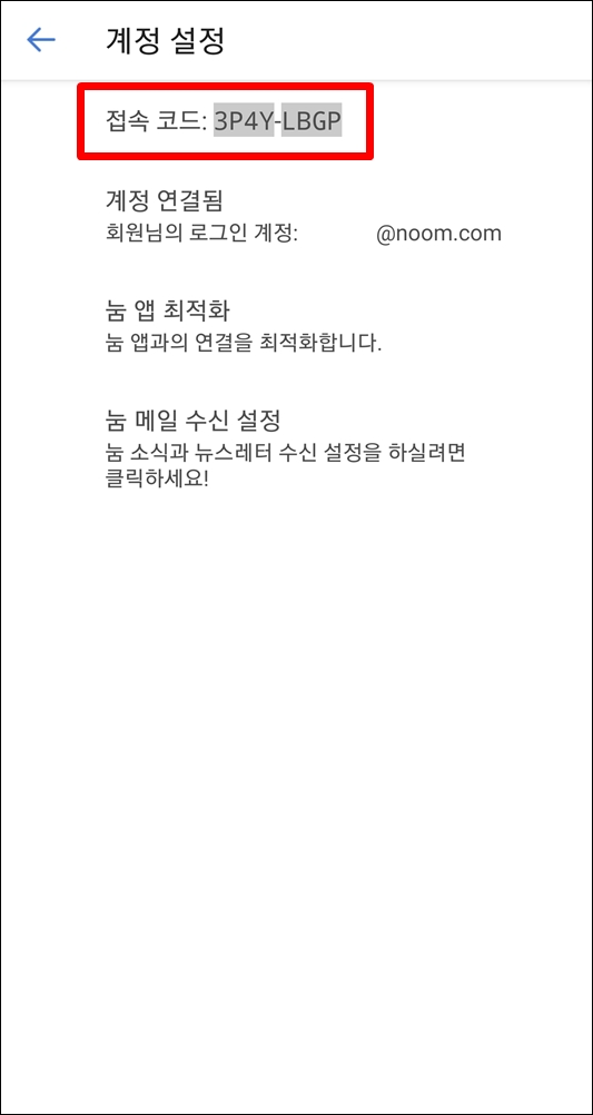 눔 계정 별로 생성되는 고유 코드입니다. 만약 계정이 두 개일 경우 접속코드가 각각 발급됩니다.
