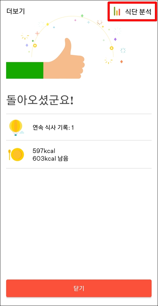식사 기록을 마치면 피드백 화면이 나타나며, 오른쪽 상단 모서리에 “식단 분석”을 클릭하여 확인 하실 수 있습니다. 😀