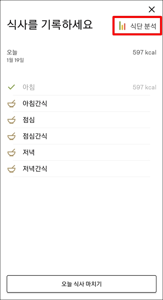 이미 기록한 식단의 칼로리를 찾으려면 기록이 완료된 “오늘의 식사를 기록하세요”를 클릭 후 오른쪽 상단 모서리에 “식단 분석”버튼을 확인하실 수 있습니다. 클릭하면, 기록한 음식의 신호등 색상을 볼 수 있습니다.