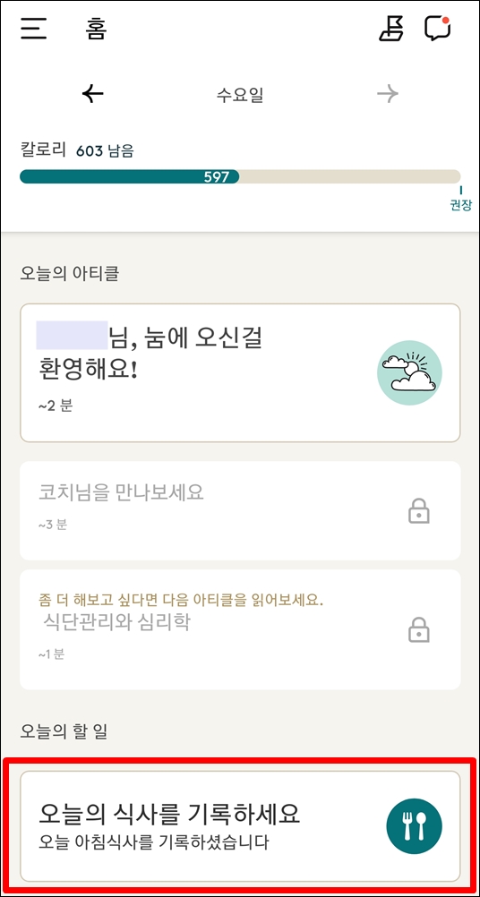 홈 화면의 “오늘의 식사를 기록하세요”를 클릭하여 식사를 기록하세요.