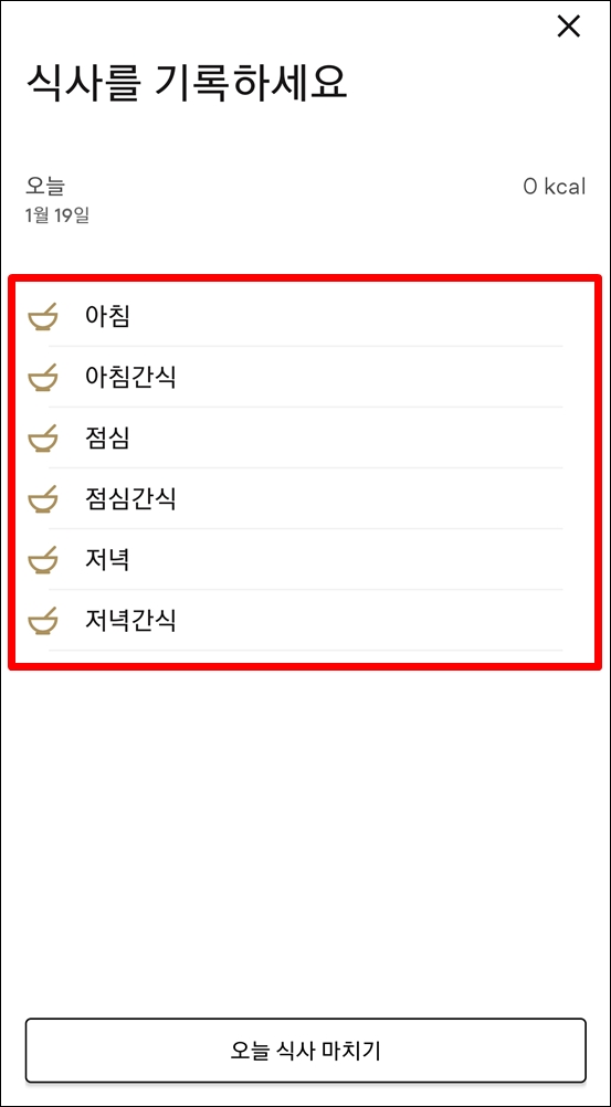 1. 하루의 식사 기록을 모두 마친 후 ‘오늘 식사 마치기‘를 클릭하면 입력하지 않은 끼니가 표시됩니다.