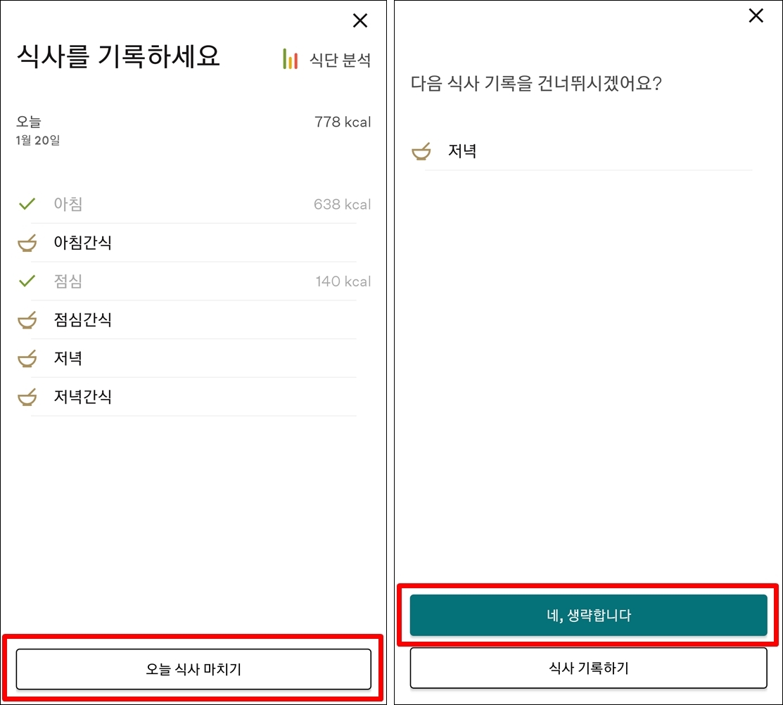식사를 건너뛰었을 경우, 두 가지 방법으로 식사기록을 생략할 수 있습니다.