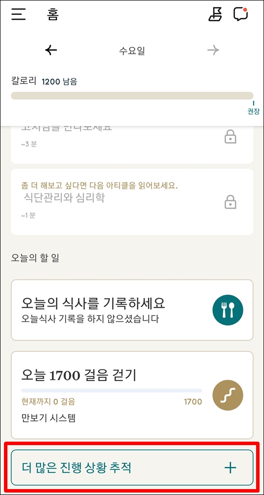 1. 눔 앱 홈 화면 하단의 더 많은 진행상황 추적 클릭