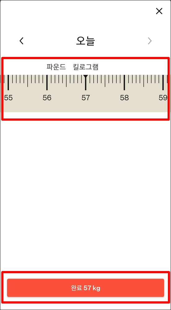 3. 줄자를 이용해 체중 선택 후 아래 ‘완료‘ 버튼 클릭